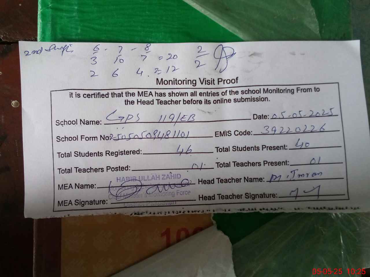 | Attendance Register | Head Teacher | MEA with School | Visit Proof |