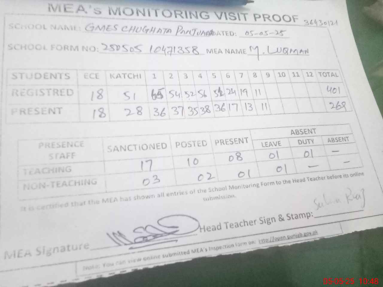 | EMIS Code: 36430121 | Name of School: GMES CHUGHATA PUNJUANA, TULAMBA | |||
