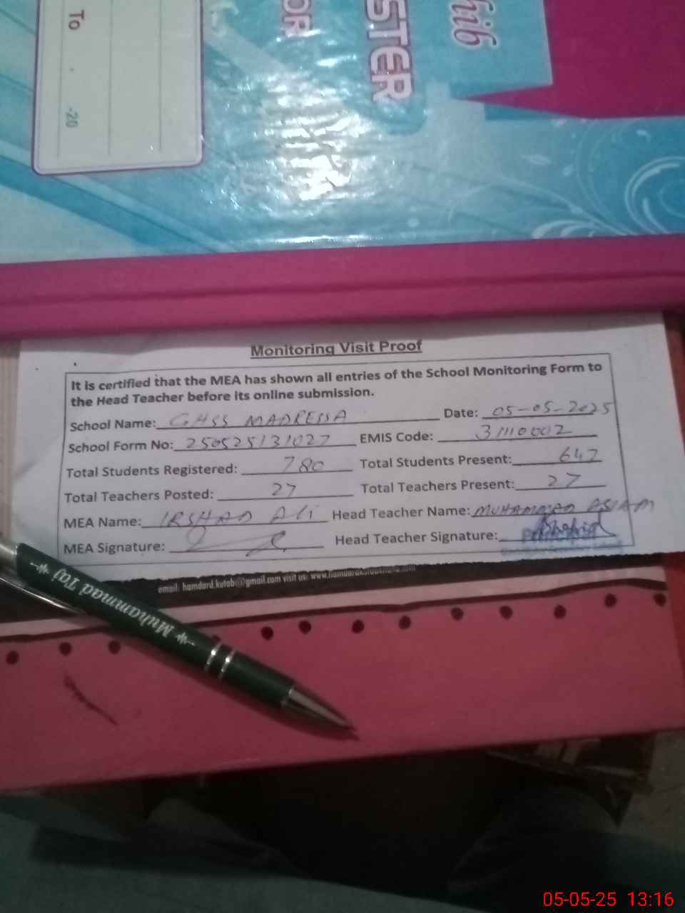 | Attendance Register | Head Teacher | MEA with School | Visit Proof |