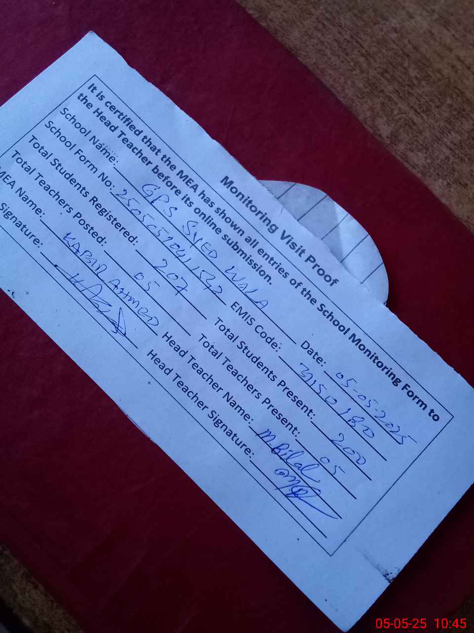 | EMIS Code: 31150180 | Name of School: GPS SAYED WALA | |||