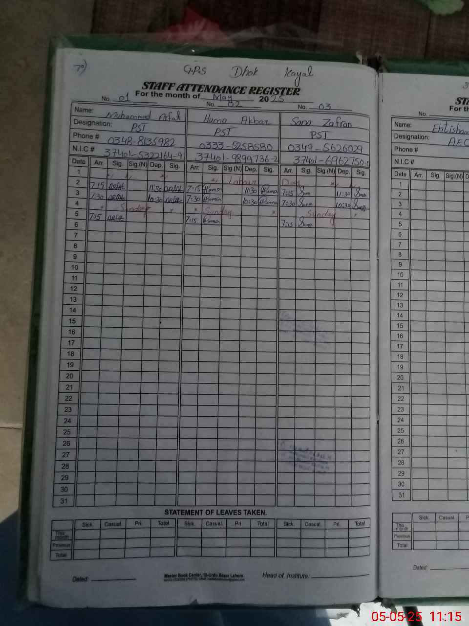 | CNIC | Full Name | Designation | R/C | Absence During Last Calender Month |
