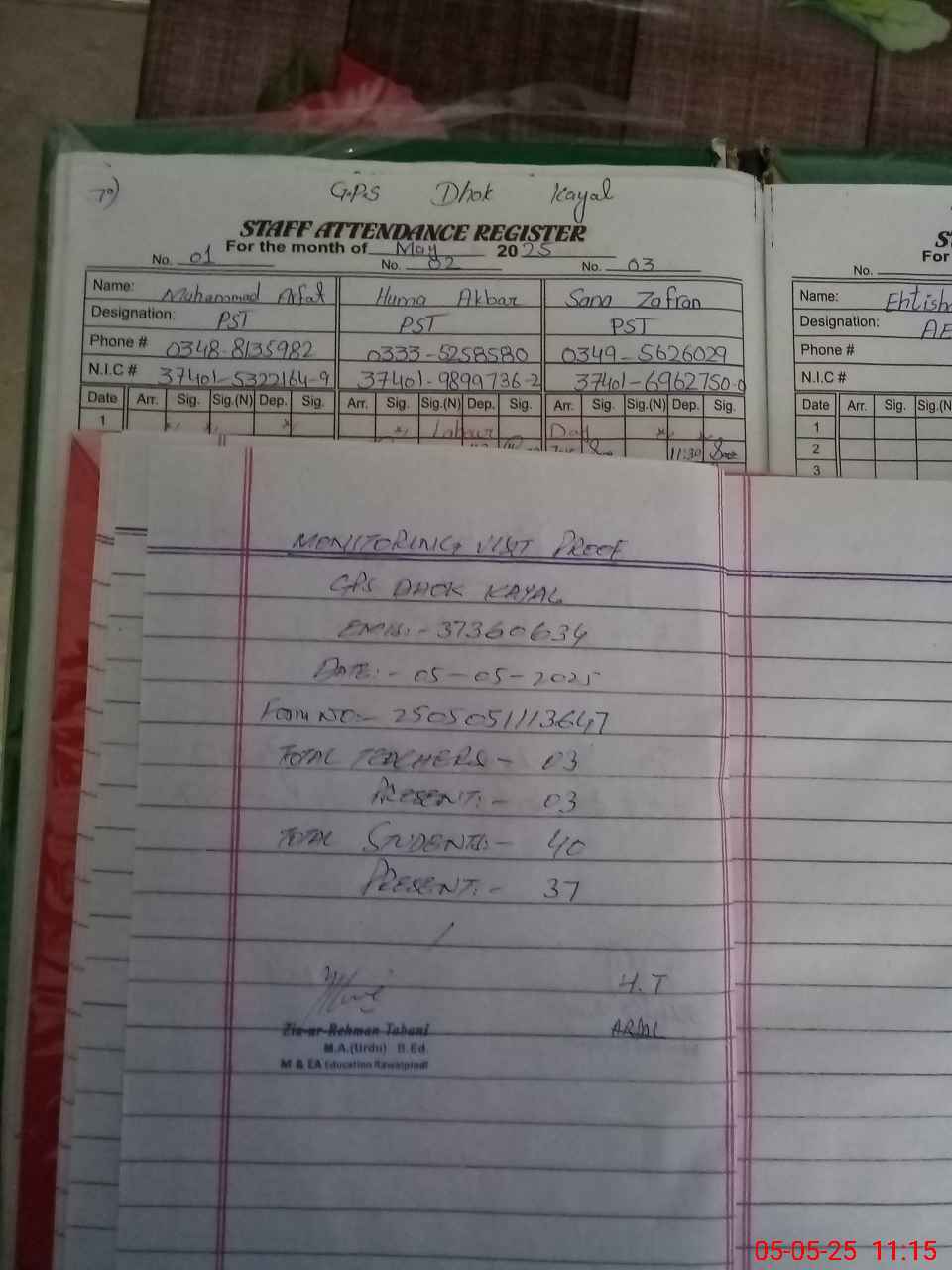 | Name: MU**** Sa**** Designation: (School Headmaster's/Headmistress's) ESE MATH Phone/Cell Number: 03**** |