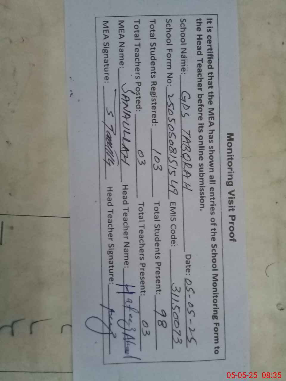 | Attendance Register | Head Teacher | MEA with School | Visit Proof |