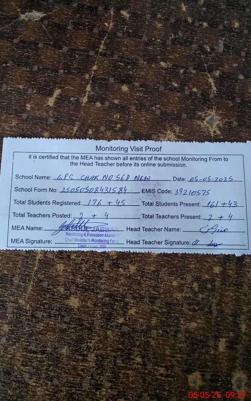 | EMIS Code: 39210575 | Name of School: GPS CHAK NO. 56/D (NEW) | |||