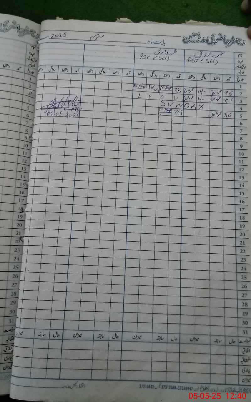 | CNIC | Full Name | Designation | R/C | Absence During Last Calender Month |