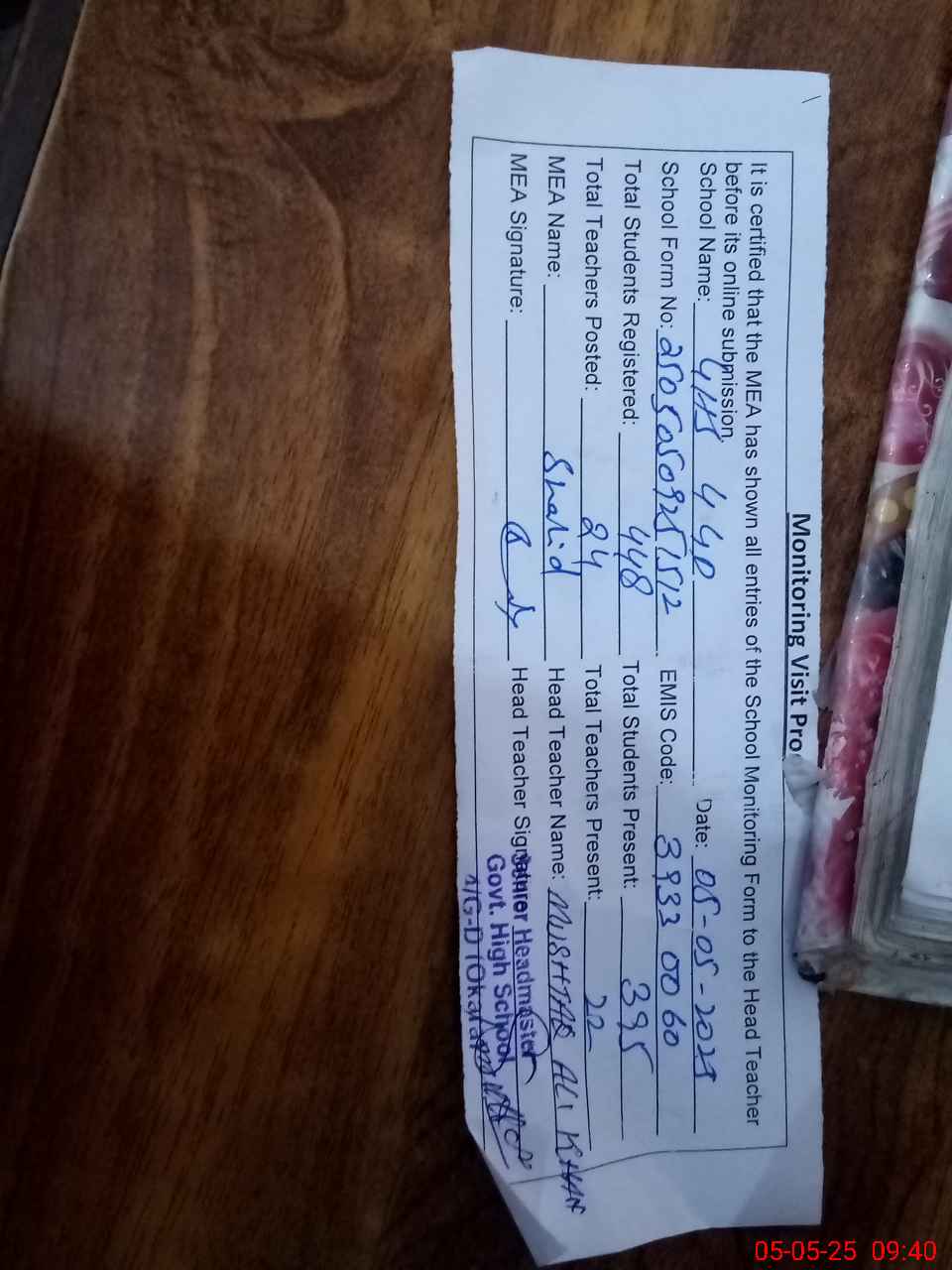 | Certified that this School was Inspected by the Undersigned MEA/DMO Today and the Information Stated Above is as Per Record. | |||||
