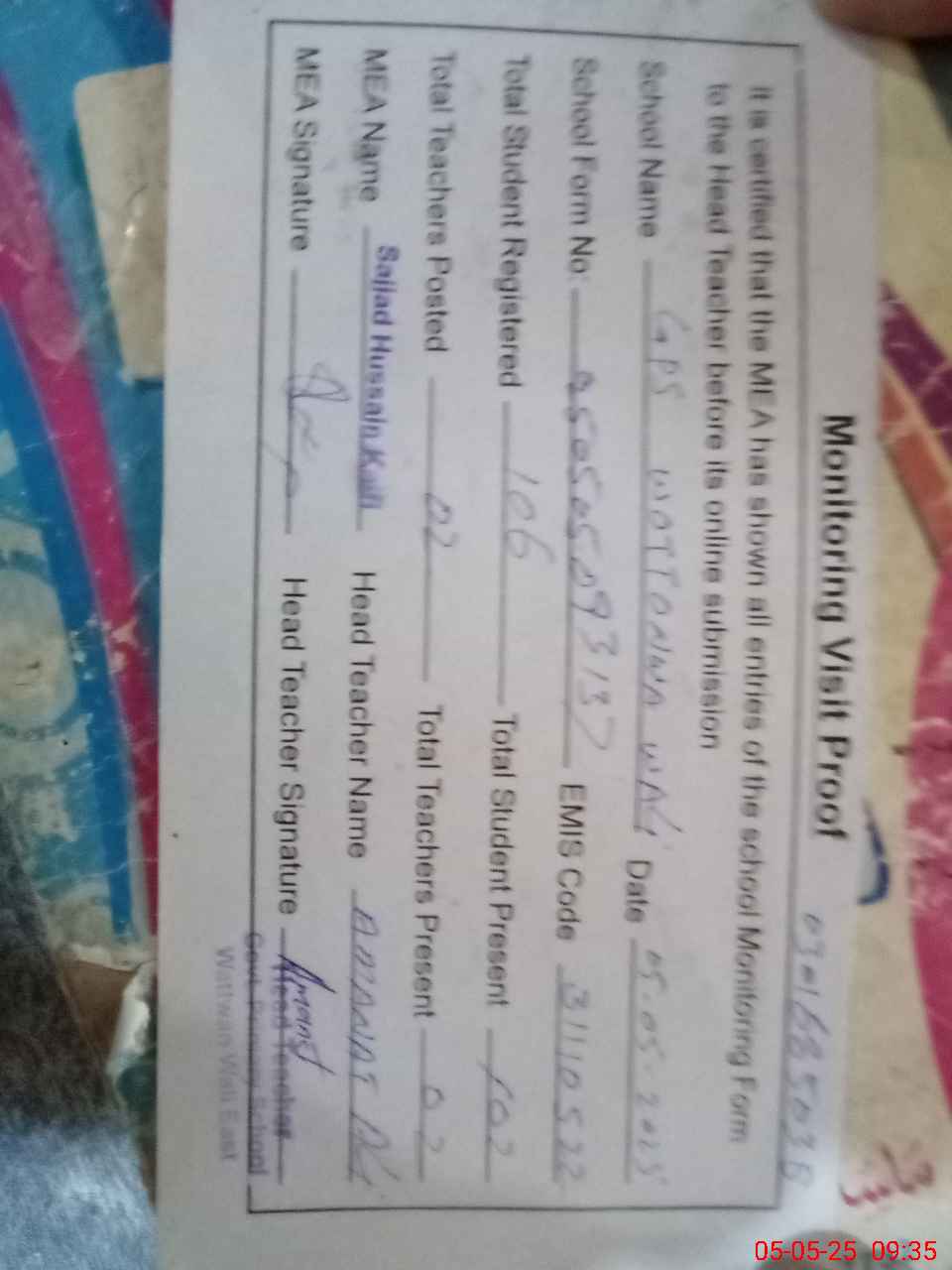| EMIS Code: 31110522 | Name of School: GPS WATTWAN WALI EAST | |||