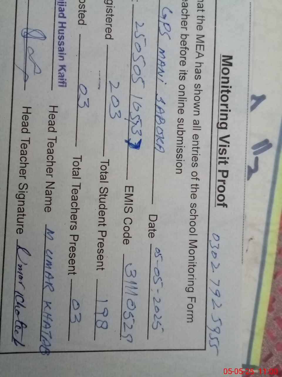 | Name: MUM**** KH**** Designation: (School Headmaster's/Headmistress's) Pst Phone/Cell Number: 03**** |