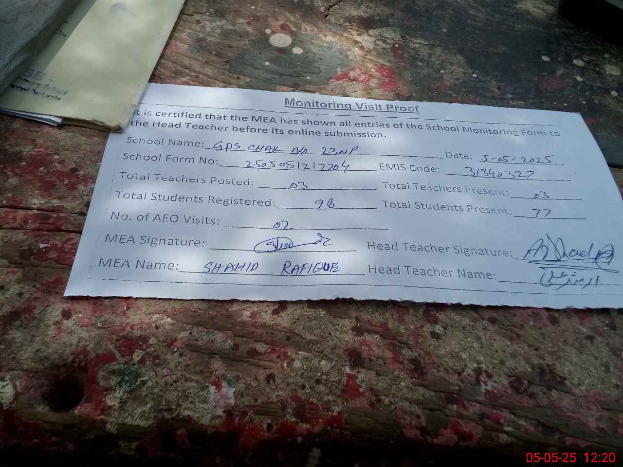 | Attendance Register | Head Teacher | MEA with School | Visit Proof |