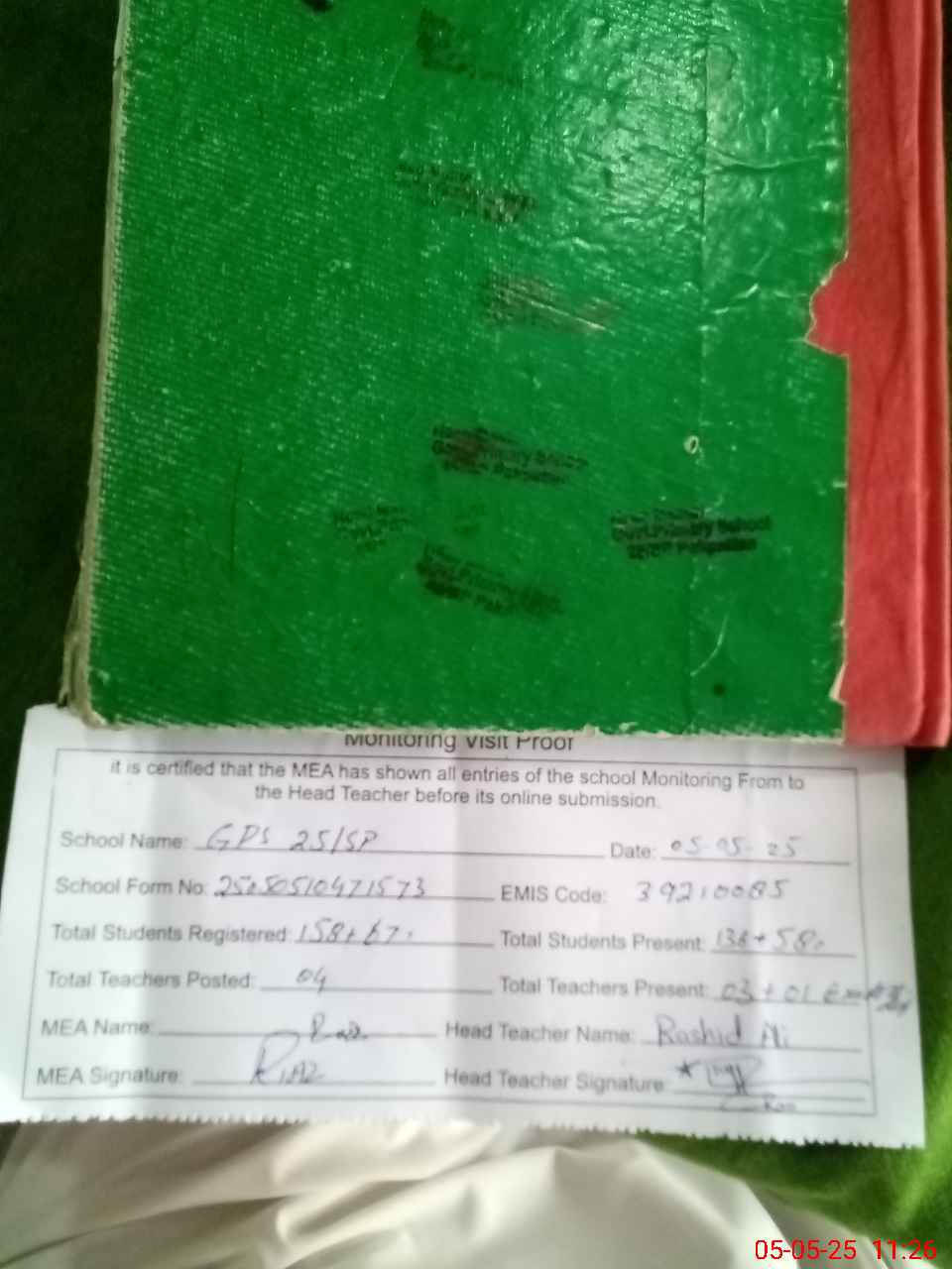 | Attendance Register | Head Teacher | MEA with School | Visit Proof |
