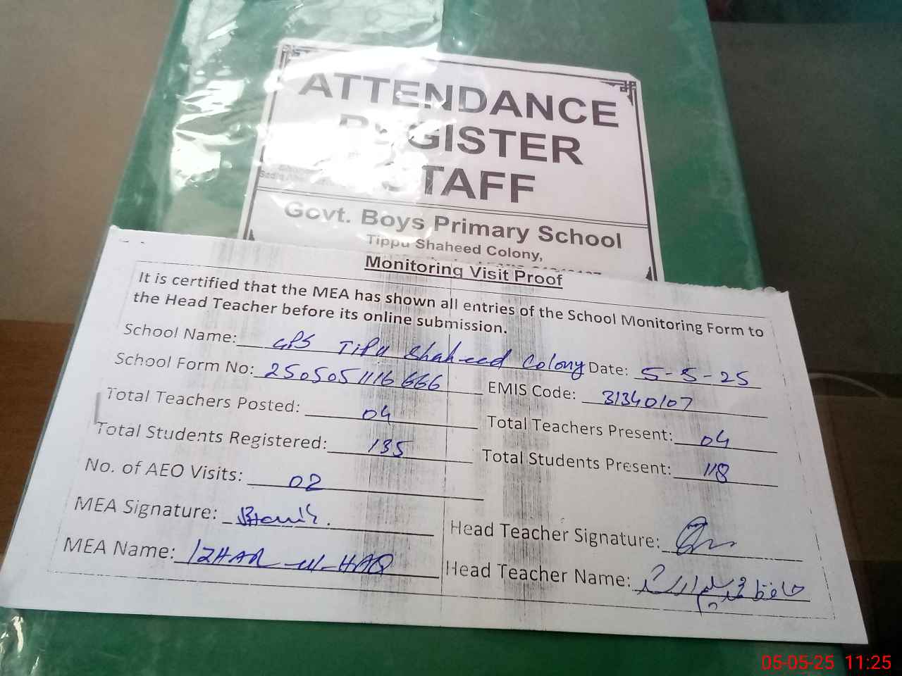 | Attendance Register | Head Teacher | MEA with School | Visit Proof |