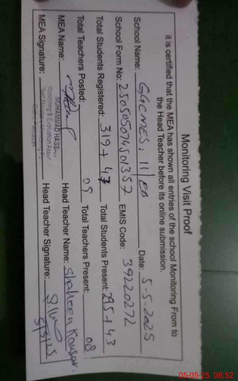 | EMIS Code: 39220272 | Name of School: GGCMES 11 EB P/O PIR SADAR DIN | |||