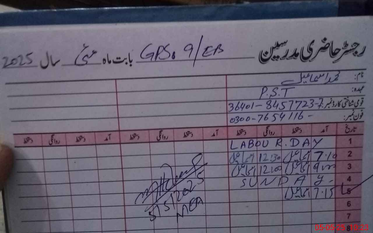 | Name: MU**** IS**** Designation: (School Headmaster's/Headmistress's) PST Phone/Cell Number: 03**** |