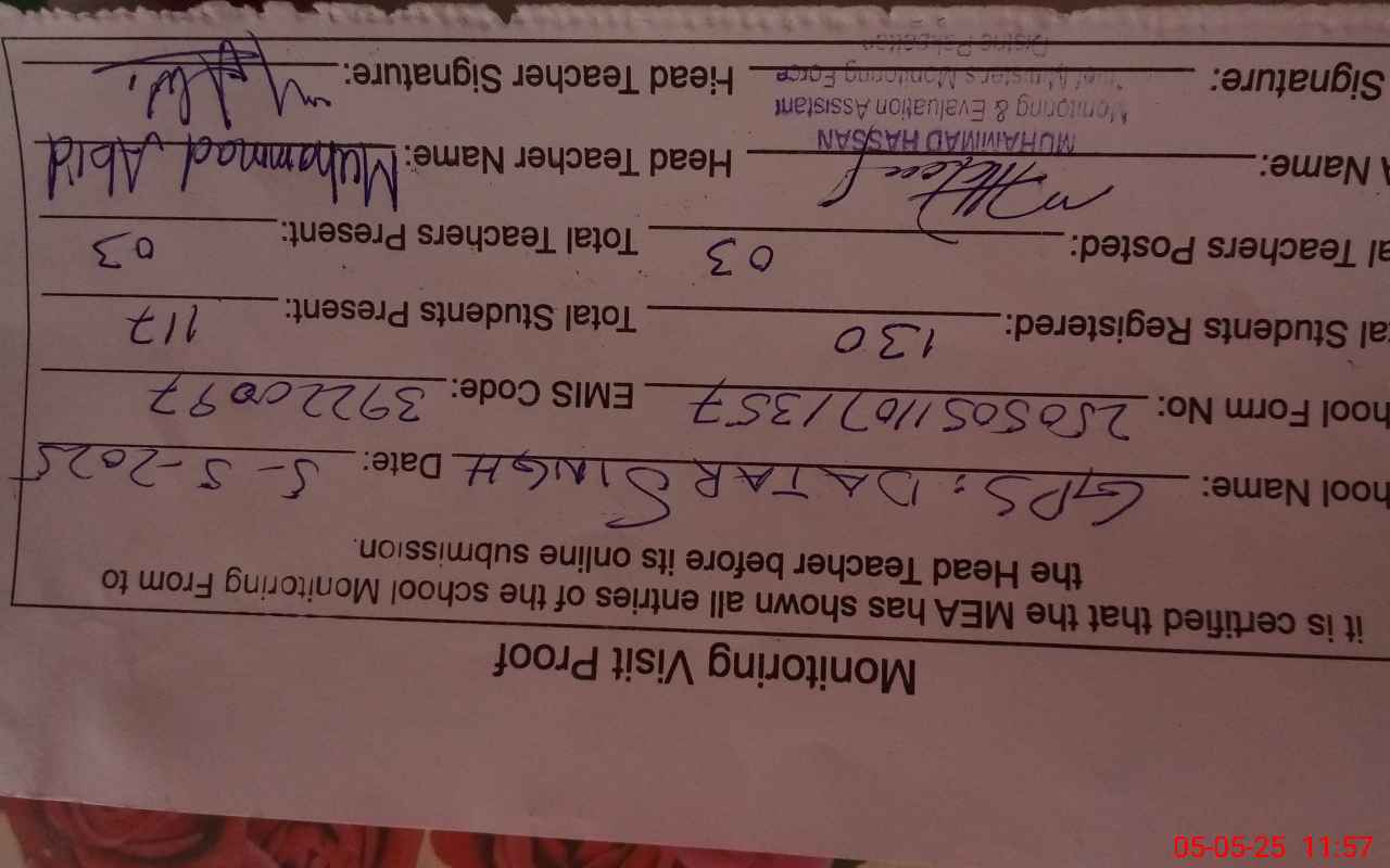 | EMIS Code: 39220097 | Name of School: GPS DATAR SINGH | |||