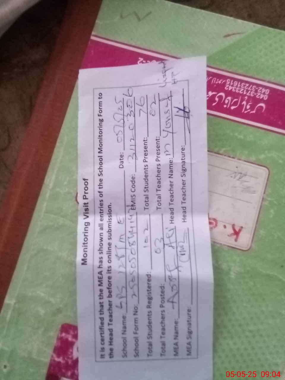 | Attendance Register | Head Teacher | MEA with School | Visit Proof |