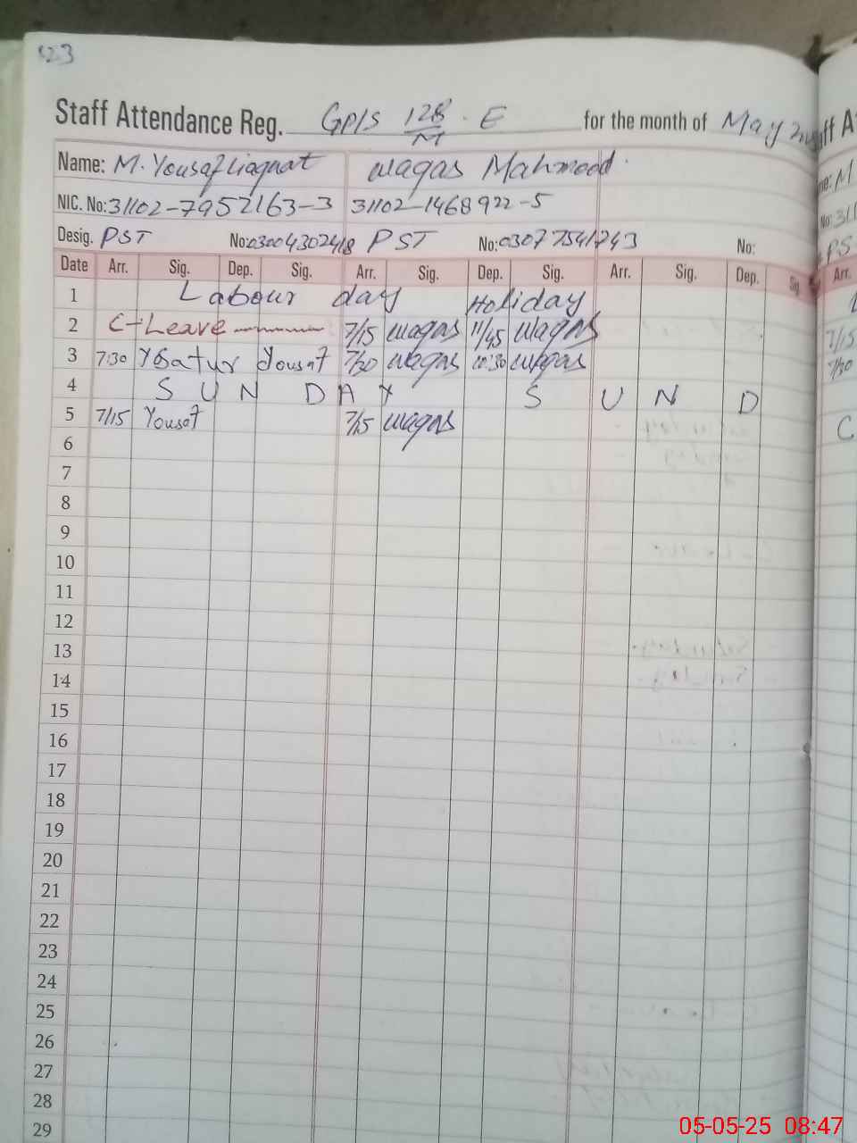 | CNIC | Full Name | Designation | R/C | Absence During Last Calender Month |