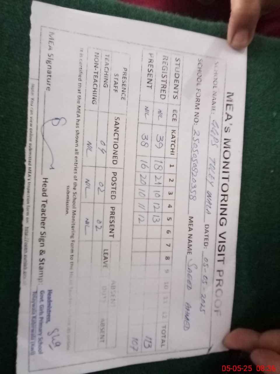 | Attendance Register | Head Teacher | MEA with School | Visit Proof |