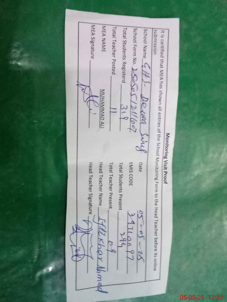 | Attendance Register | Head Teacher | MEA with School | Visit Proof |