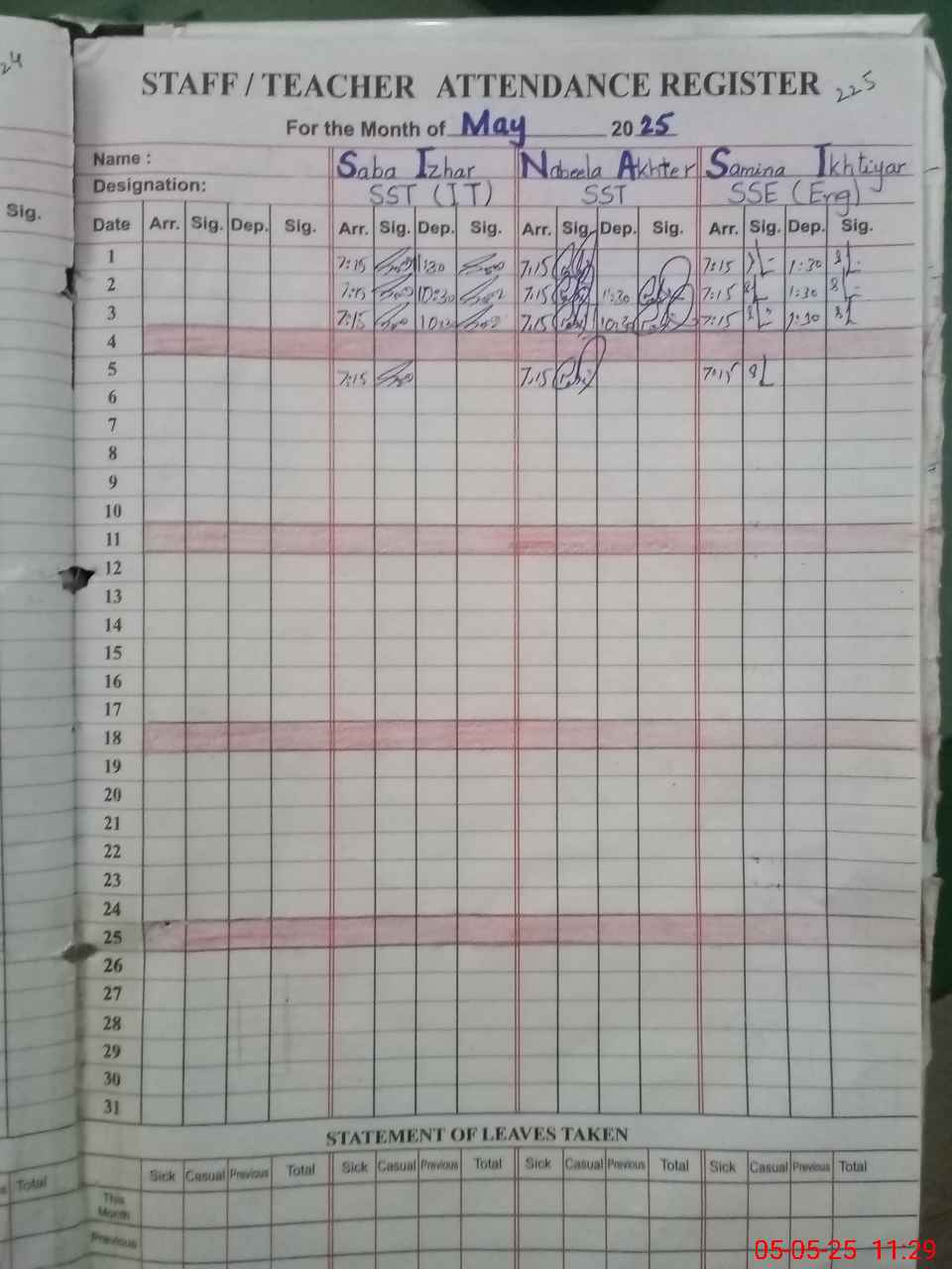 | CNIC | Full Name | Designation | R/C | Absence During Last Calender Month |