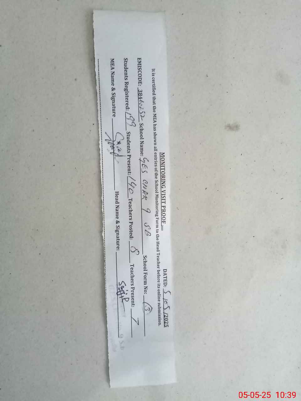 | Attendance Register | Head Teacher | MEA with School | Visit Proof |