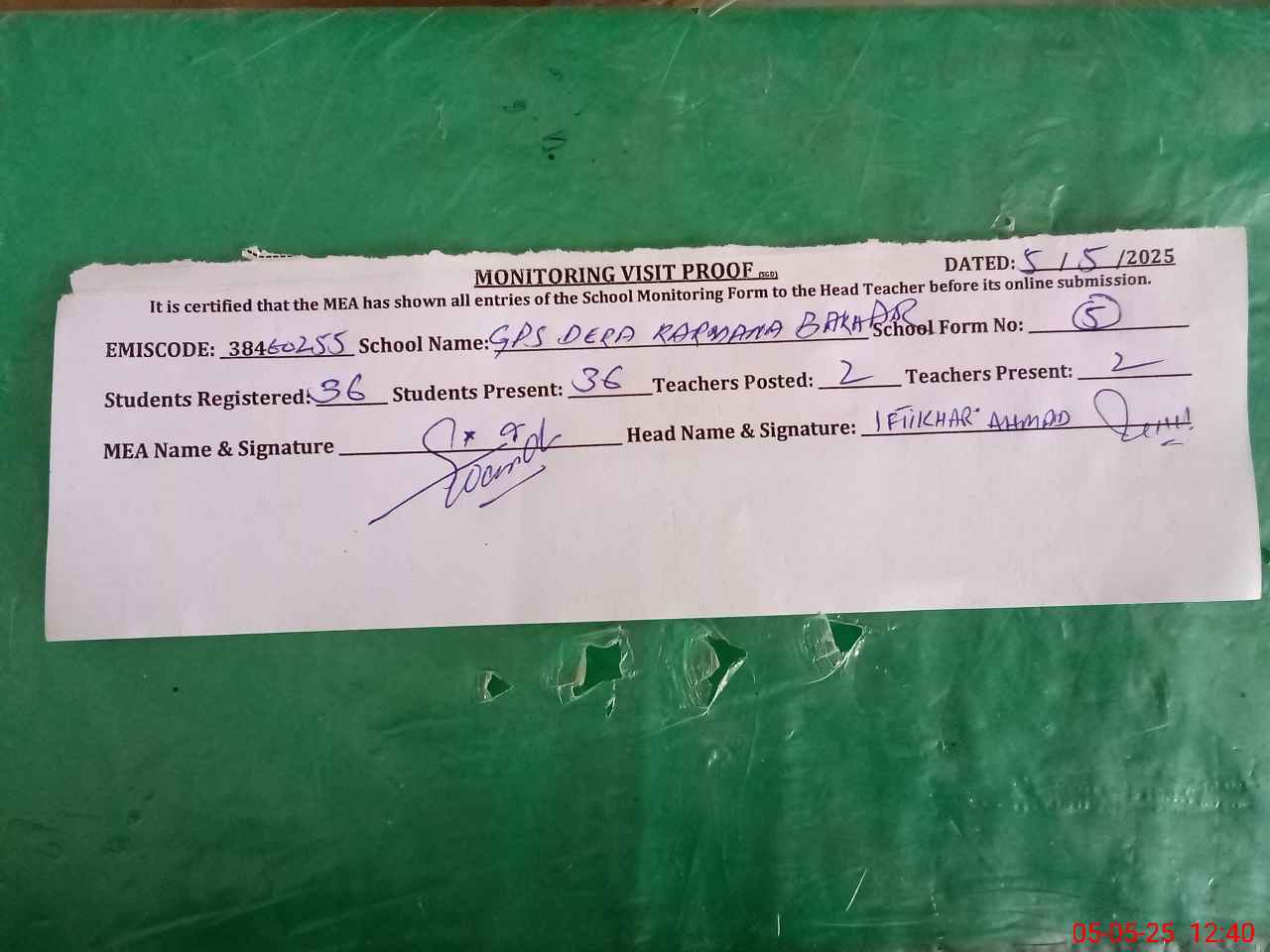 | Attendance Register | Head Teacher | MEA with School | Visit Proof |