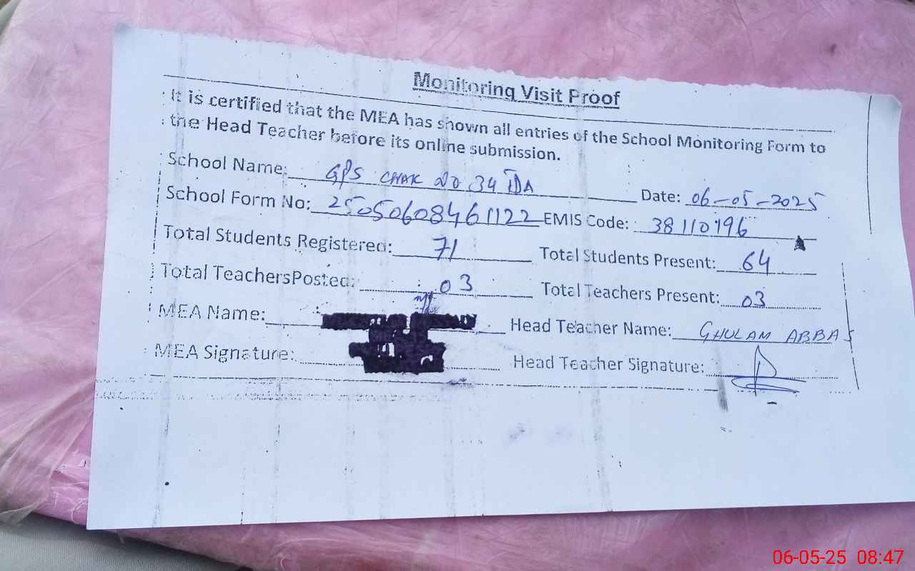| EMIS Code: 38110196 | Name of School: GPS CHAK NO 34 TDA | |||