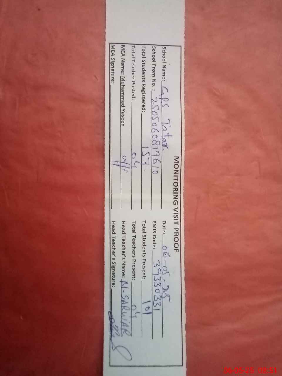| Attendance Register | Head Teacher | MEA with School | Visit Proof |