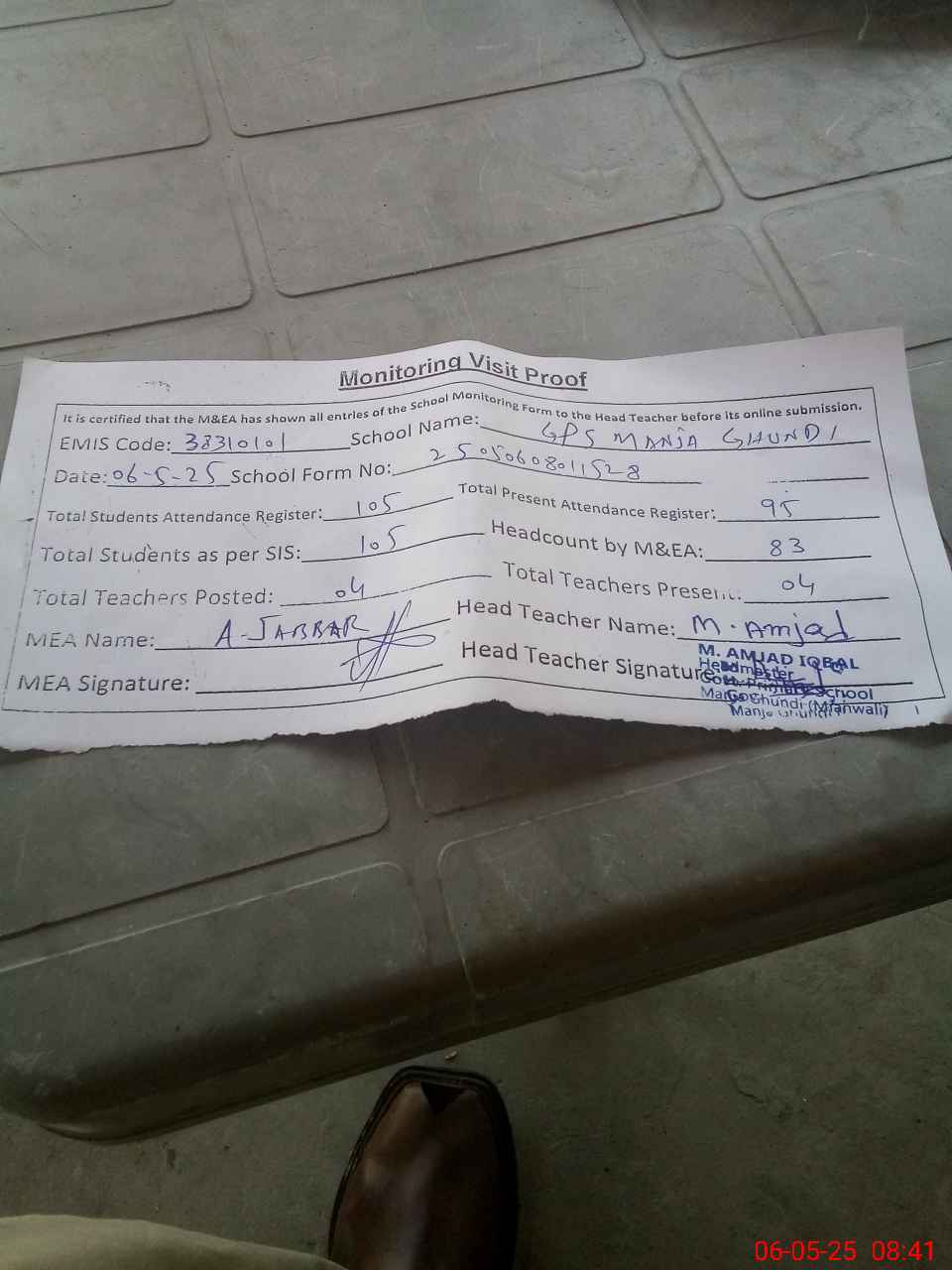 | Attendance Register | Head Teacher | MEA with School | Visit Proof |