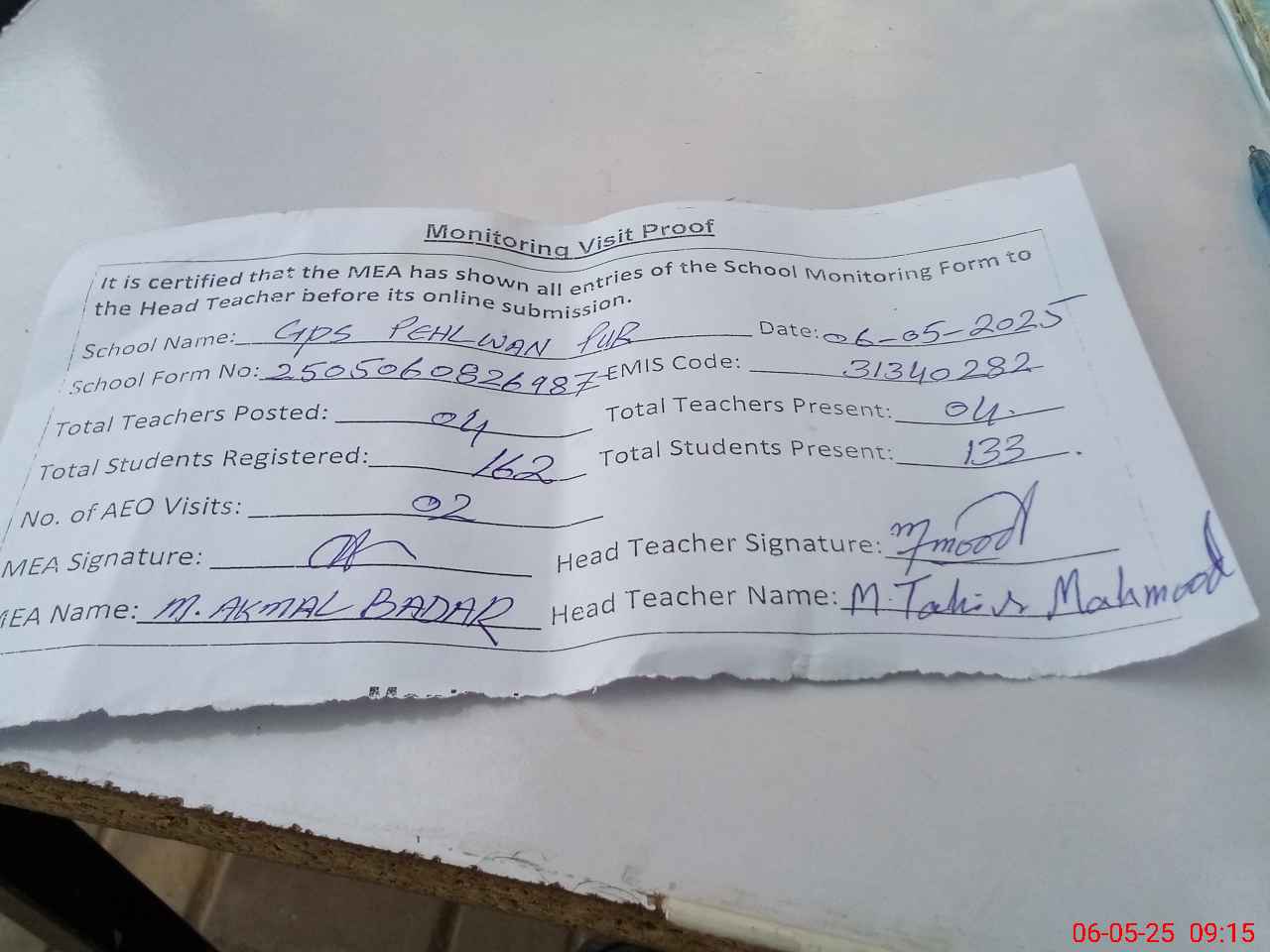 | Attendance Register | Head Teacher | MEA with School | Visit Proof |