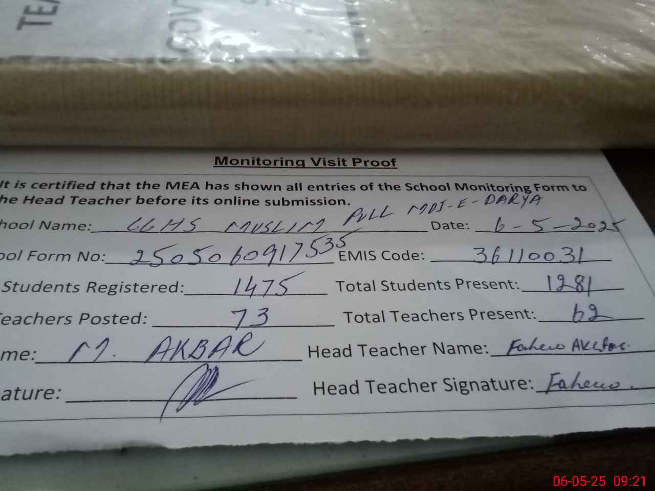 | Attendance Register | Head Teacher | MEA with School | Visit Proof |