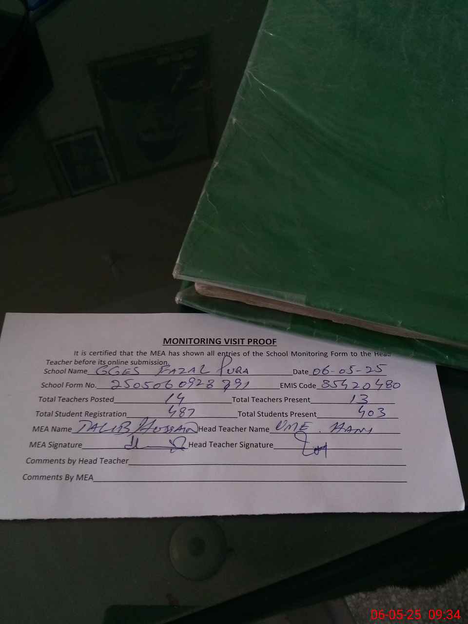 | Attendance Register | Head Teacher | MEA with School | Visit Proof |
