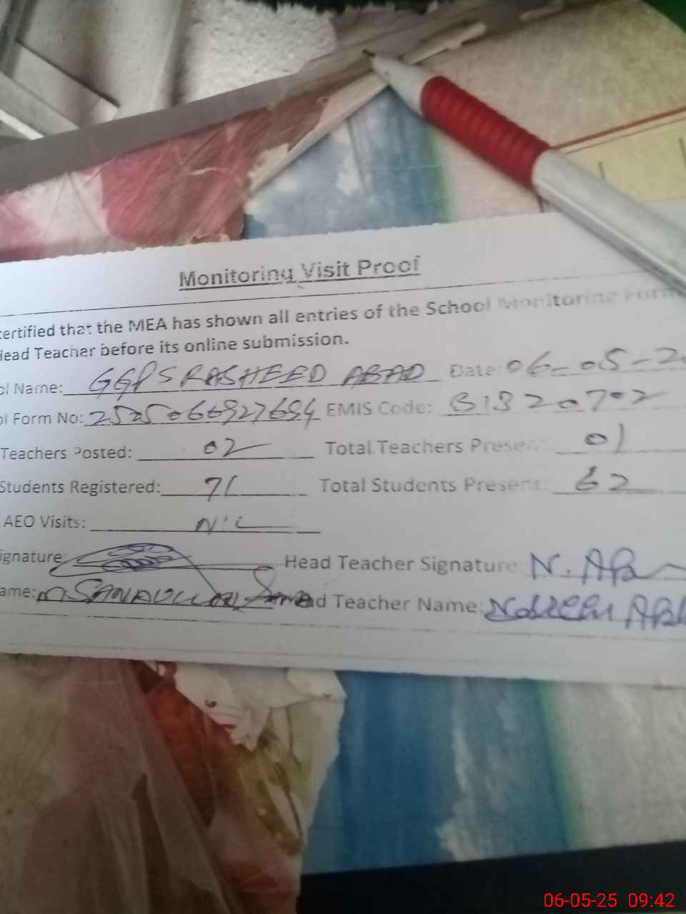 | Attendance Register | Head Teacher | MEA with School | Visit Proof |