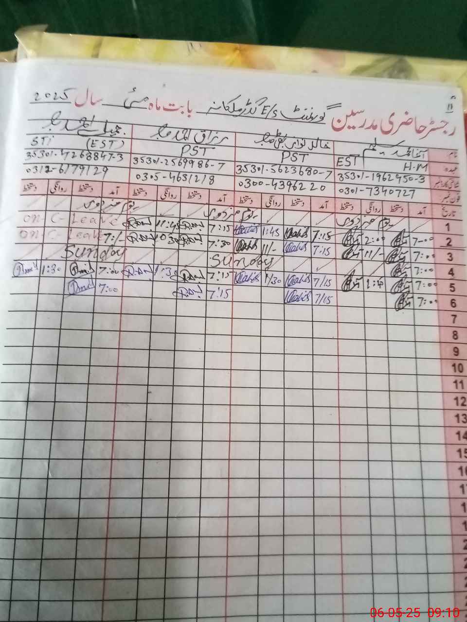 | CNIC | Full Name | Designation | R/C | Absence During Last Calender Month |