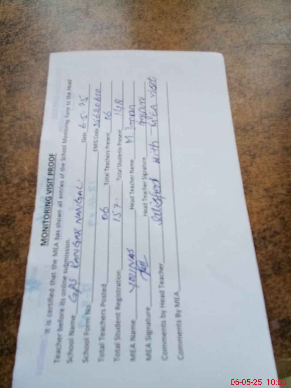| Attendance Register | Head Teacher | MEA with School | Visit Proof |