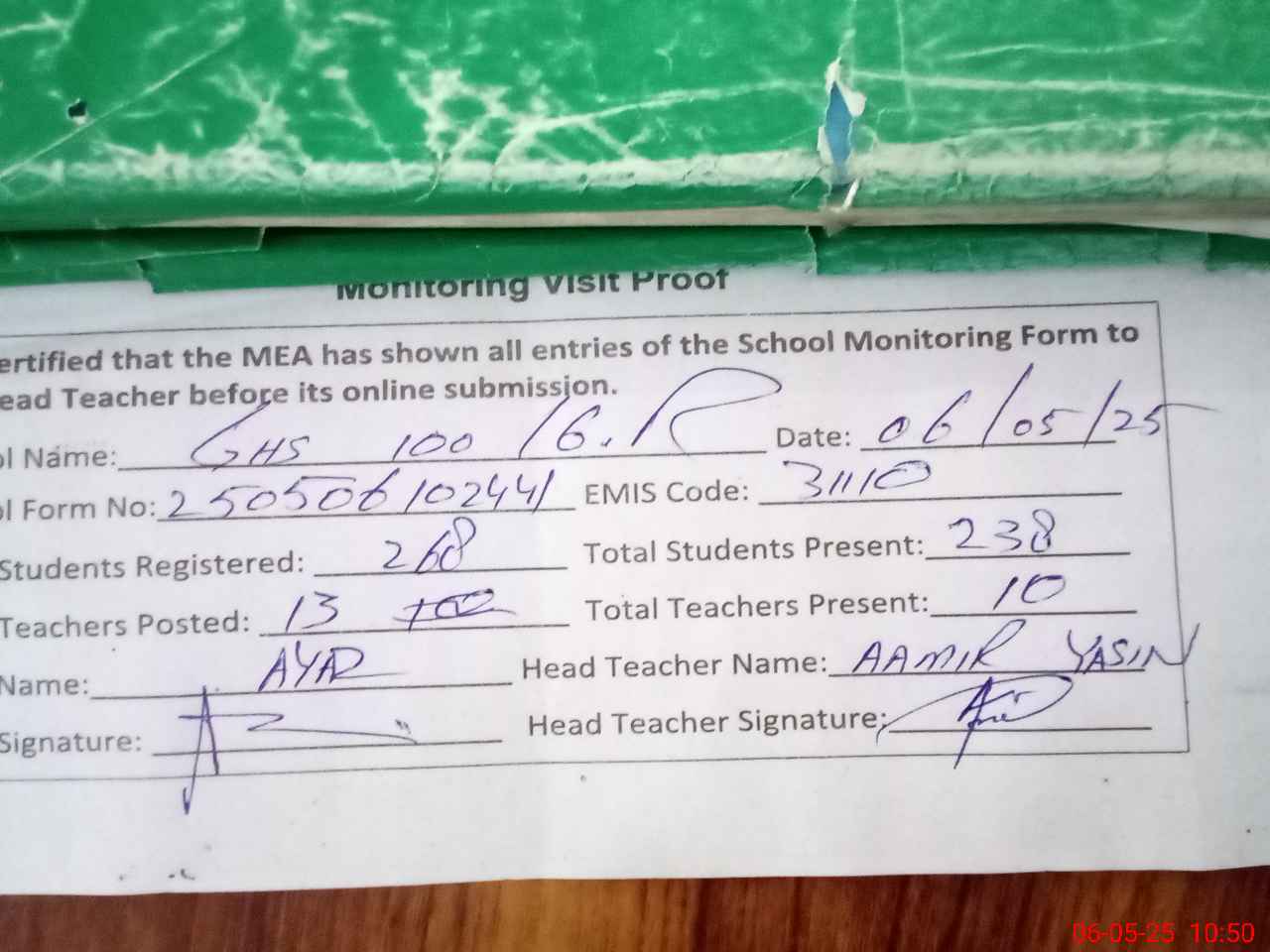 | Attendance Register | Head Teacher | MEA with School | Visit Proof |