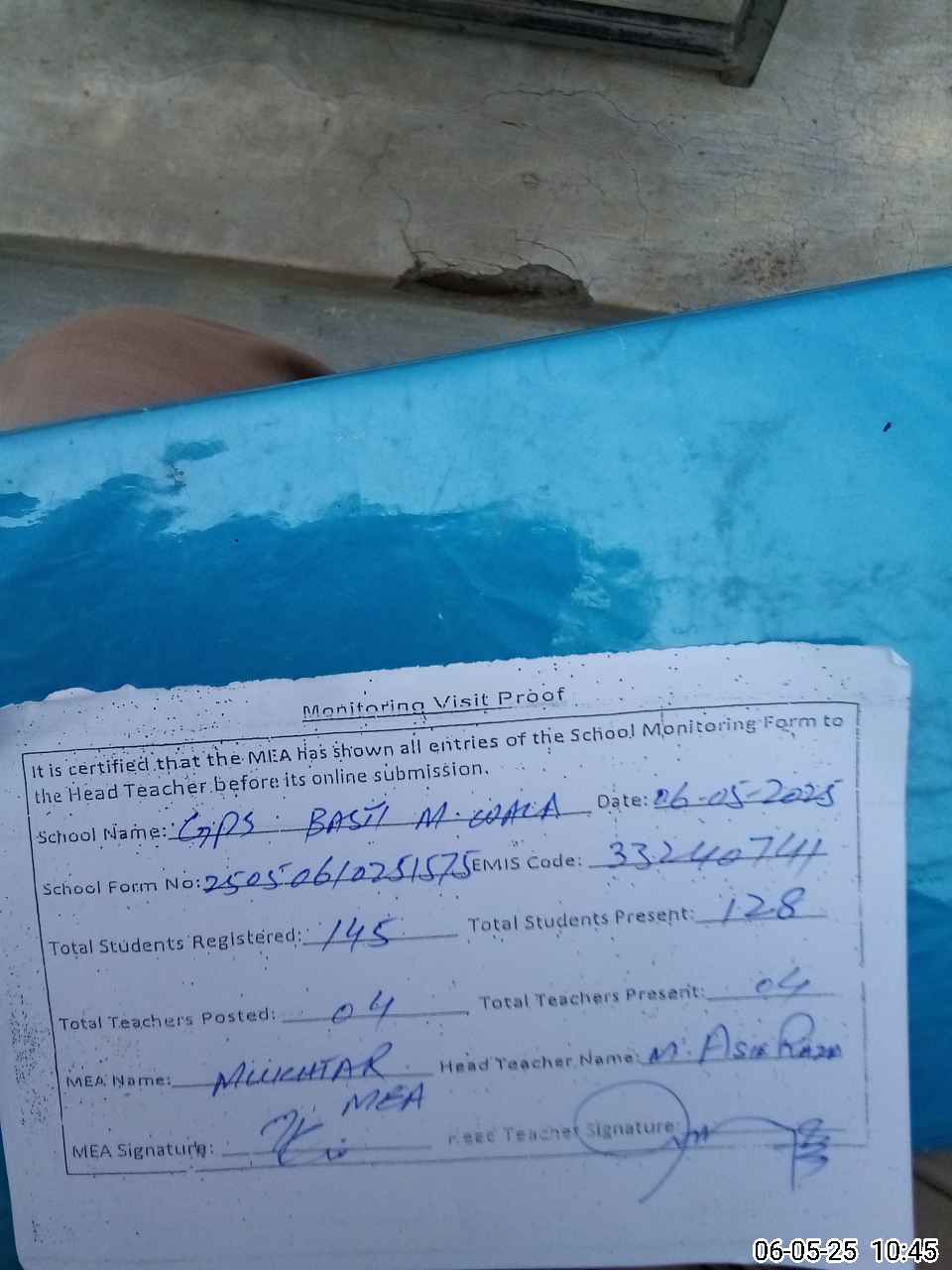 | Attendance Register | Head Teacher | MEA with School | Visit Proof |