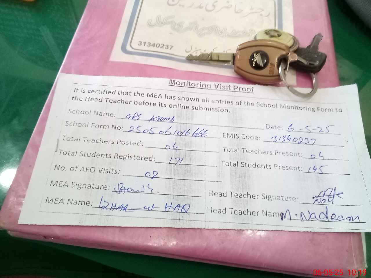 | Attendance Register | Head Teacher | MEA with School | Visit Proof |