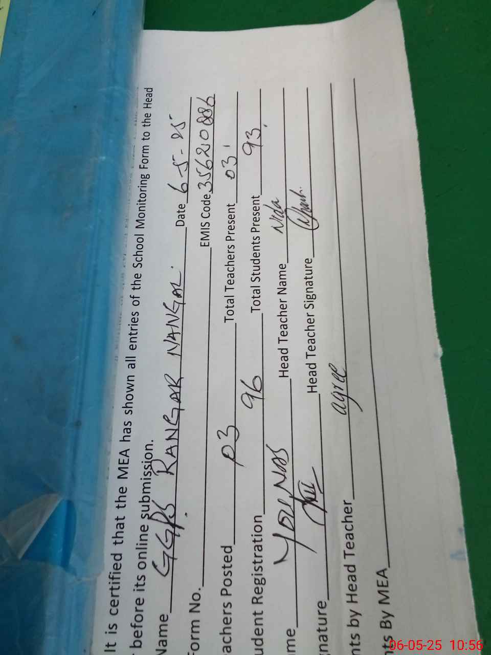 | Attendance Register | Head Teacher | MEA with School | Visit Proof |