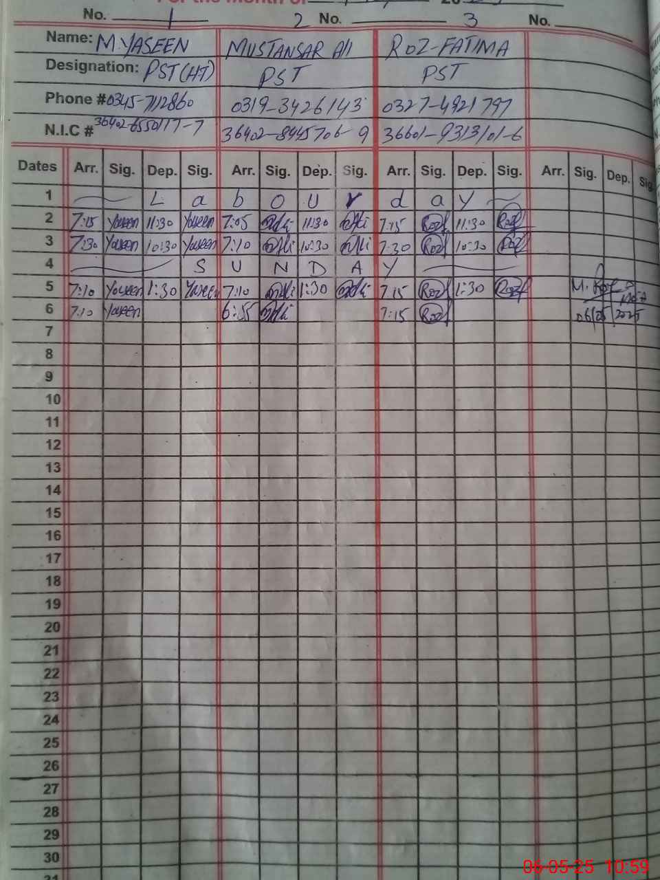 | CNIC | Full Name | Designation | R/C | Absence During Last Calender Month |