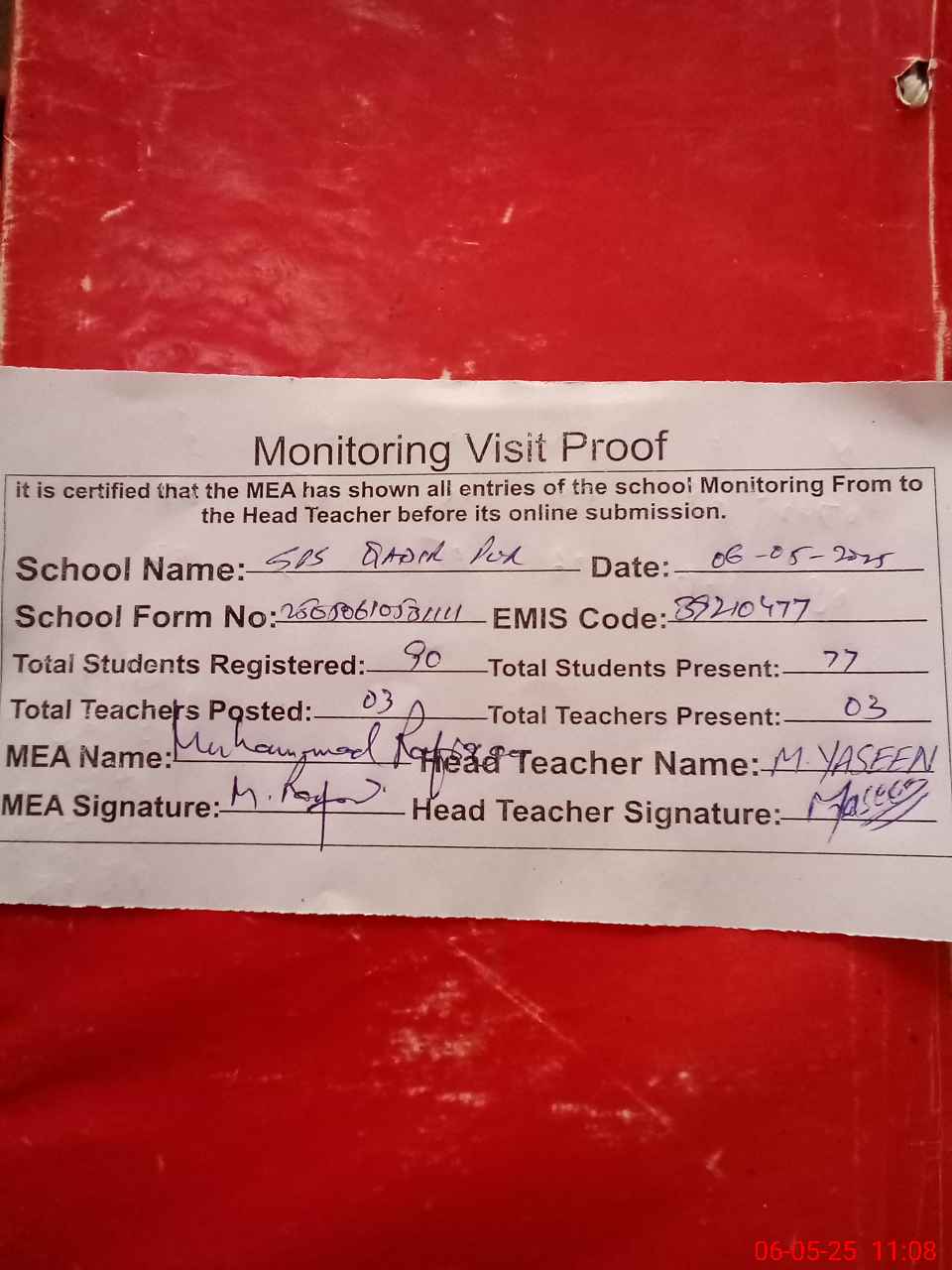 | Attendance Register | Head Teacher | MEA with School | Visit Proof |