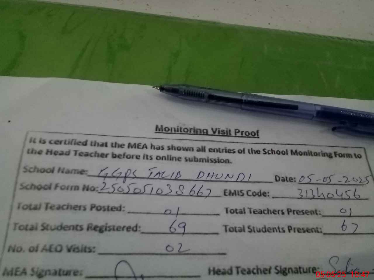 | Attendance Register | Head Teacher | MEA with School | Visit Proof |