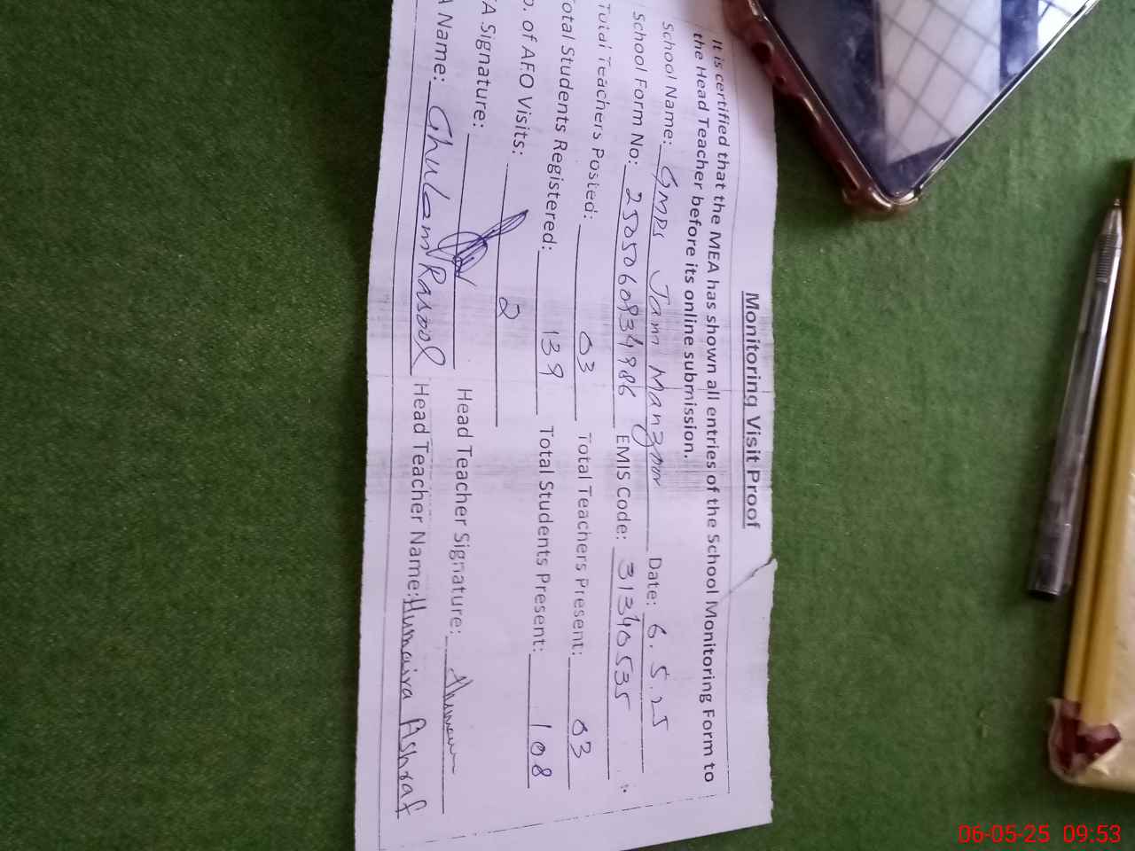 | Attendance Register | Head Teacher | MEA with School | Visit Proof |