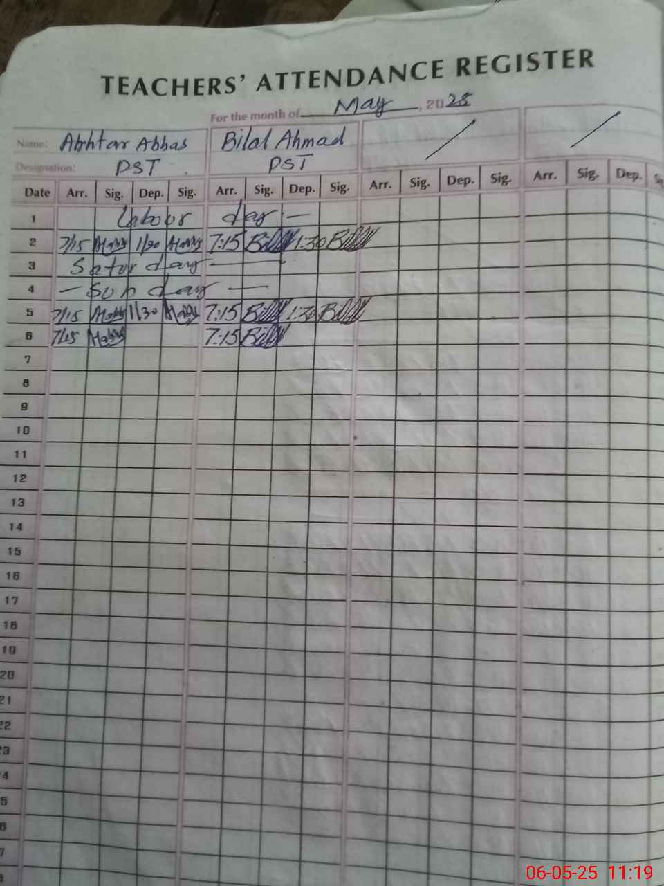 | Remarks (Use Separate Page if Required): Attendance register was not updated No attendance of month May was marked Spider webs found in the classrooms Daily Roznamcha of students not updated Enrollment marked from daily register Electricity board in the toilet was very dangerous No visit of AEO since last December 2024 in log book | |||||