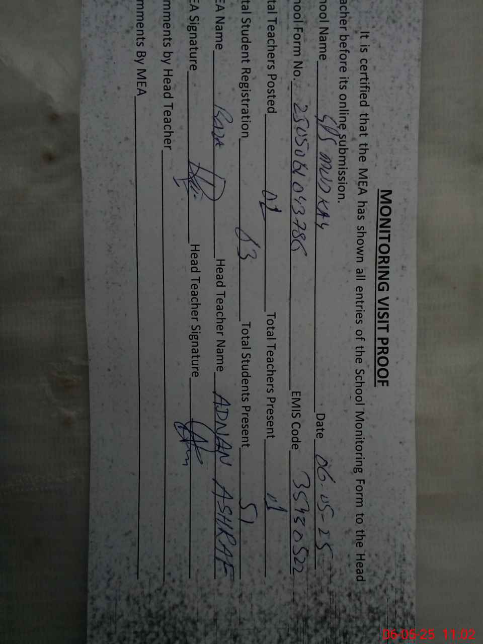 | Attendance Register | Head Teacher | MEA with School | Visit Proof |