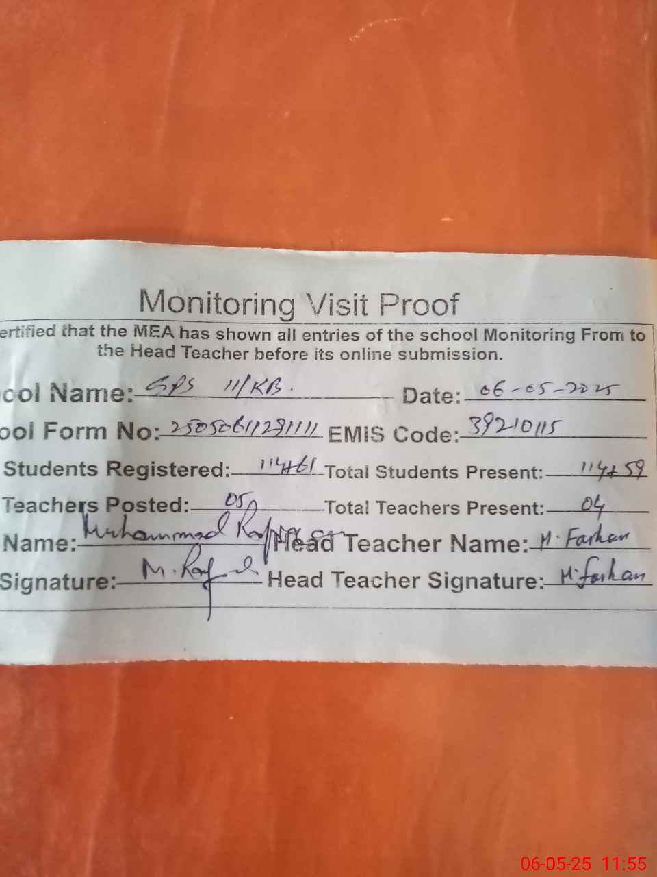 | Attendance Register | Head Teacher | MEA with School | Visit Proof |