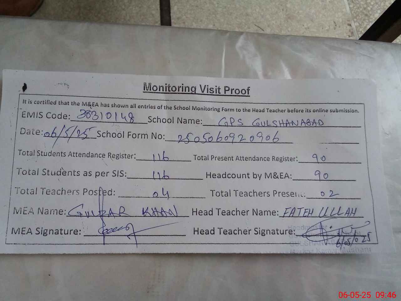 | Attendance Register | Head Teacher | MEA with School | Visit Proof |