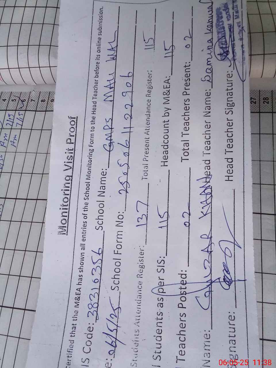 | Attendance Register | Head Teacher | MEA with School | Visit Proof |