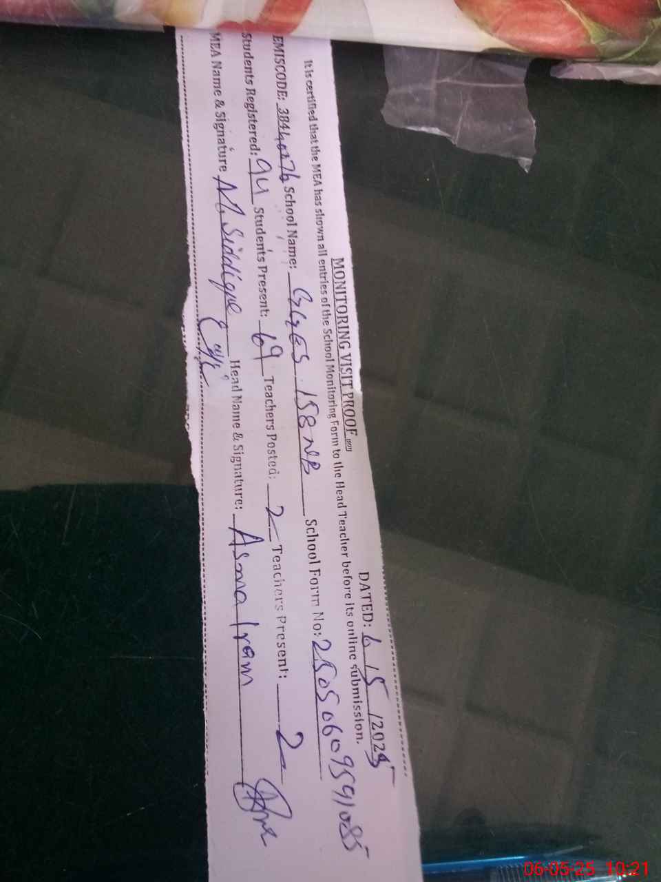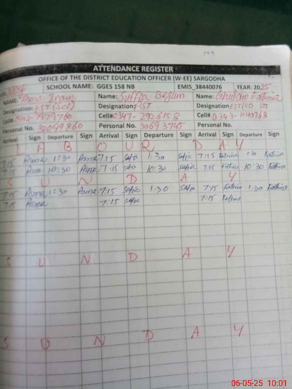 | Name: As**** Ir**** Designation: (School Headmaster's/Headmistress's) EST SCI Phone/Cell Number: 03**** |