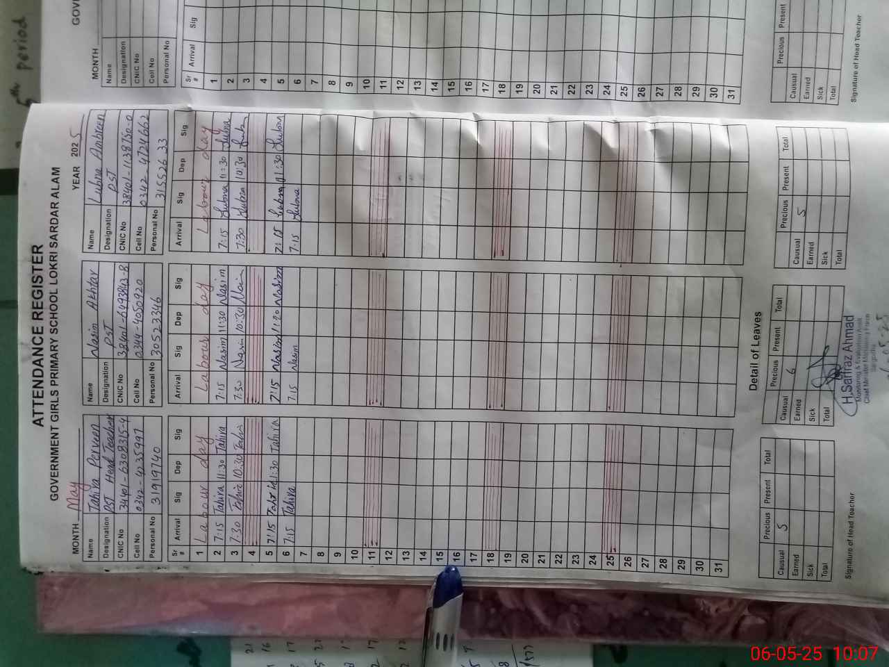 | CNIC | Full Name | Designation | R/C | Absence During Last Calender Month |