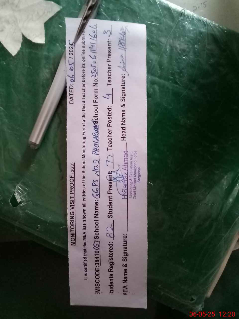 | Attendance Register | Head Teacher | MEA with School | Visit Proof |